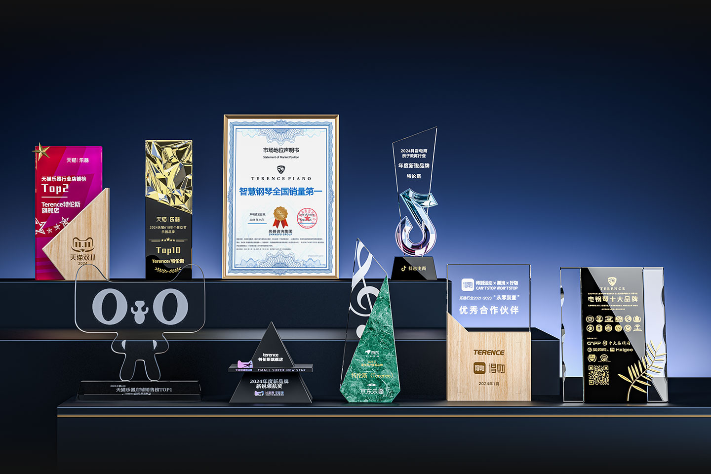 特倫斯創新科技榮獲:智慧鋼琴全國銷量第一[1]、2022年天貓樂器行業TOP1、2023年天貓618樂器行業TOP1、2024抖音電商年度新銳品牌、2024天貓樂器店鋪TOP2、2024天貓年度新品牌新銳領航獎、2023年京東最受用戶喜愛品牌等獎項;